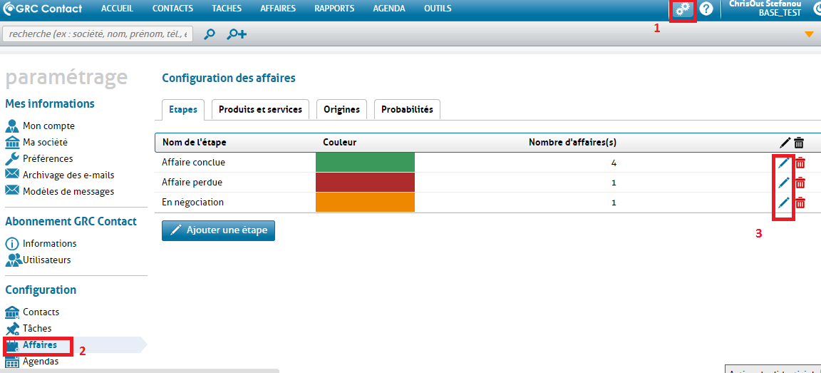 Vous avez désormais la possibilité de définir des couleurs aux différentes étapes de vos affaires. Celles-ci peuvent être paramétrées dans « Paramètres », « Affaires », « Etapes », puis modifiées sur le petit stylo :