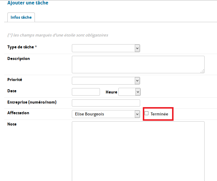 Avant ce jour, vous pouviez enregistrer une tâche terminée depuis votre fiche entreprise mais pas depuis votre liste de tâches. Vous pouvez désormais créer une tâche terminée depuis votre formulaire en cochant la case « terminée ».