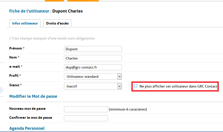 Vous pouvez désormais choisir de masquer dans les menus déroulants vos utilisateurs inactifs. Pour cela allez dans « paramètres », « utilisateurs », choisissez l’utilisateur en question et cochez « Ne plus afficher cet utilisateur dans GRC Contact », puis enregistrez.