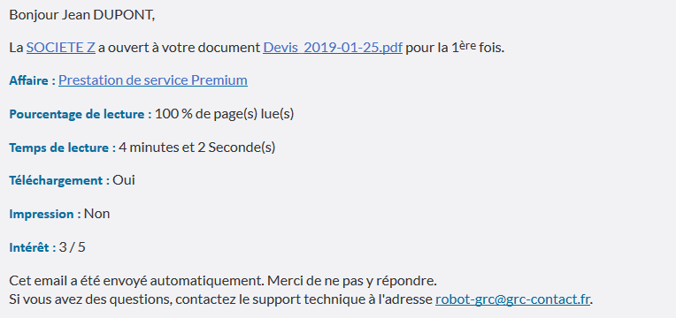 Ainsi, vous savez si votre devis (ou autre document) intéresse réellement votre prospect/client et  vous relancez donc les bonnes personnes au bon moment.